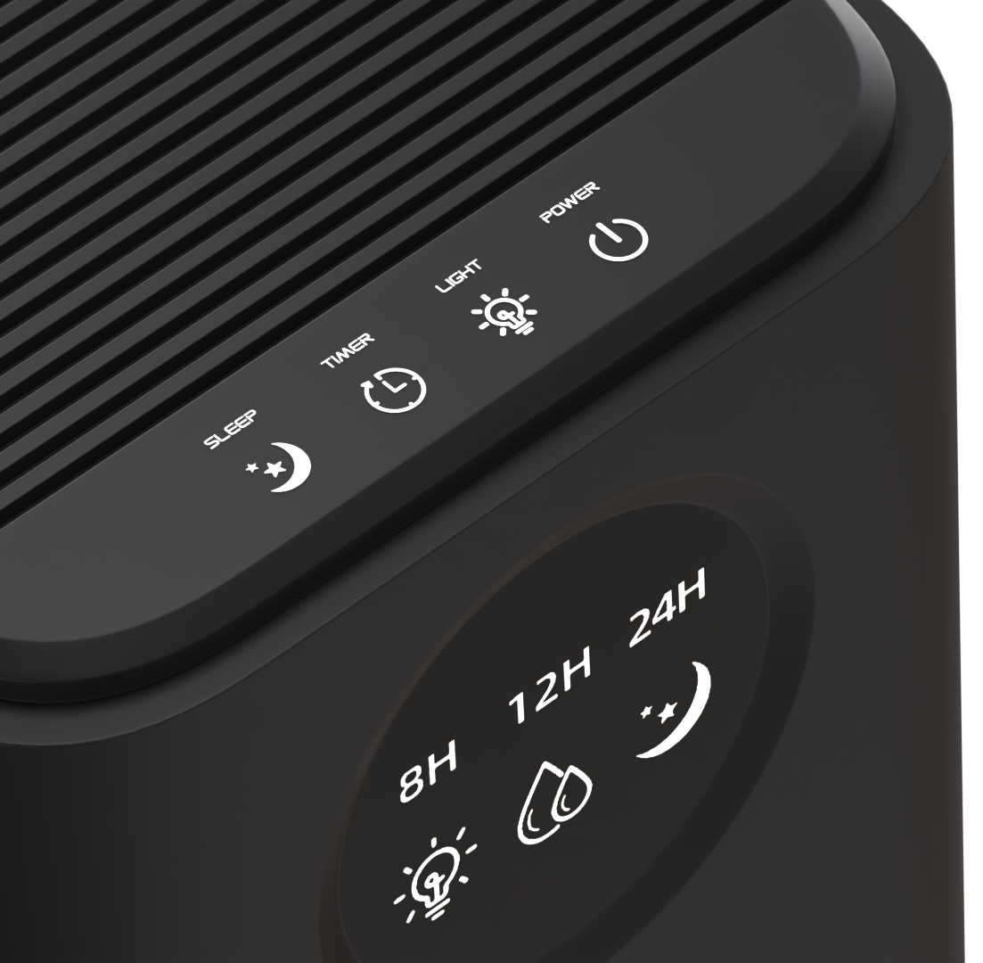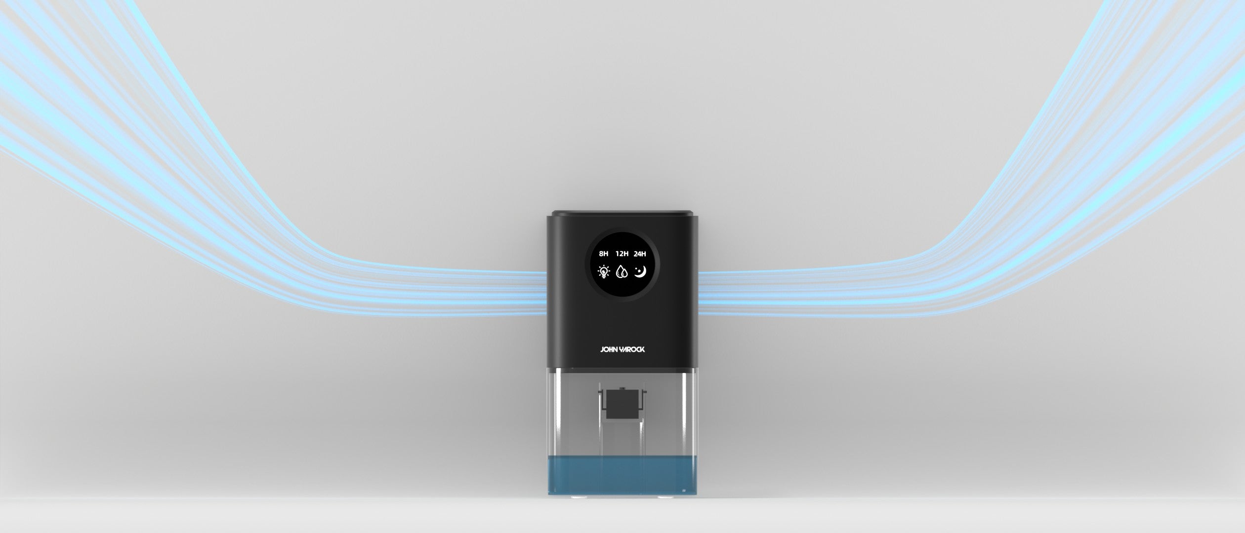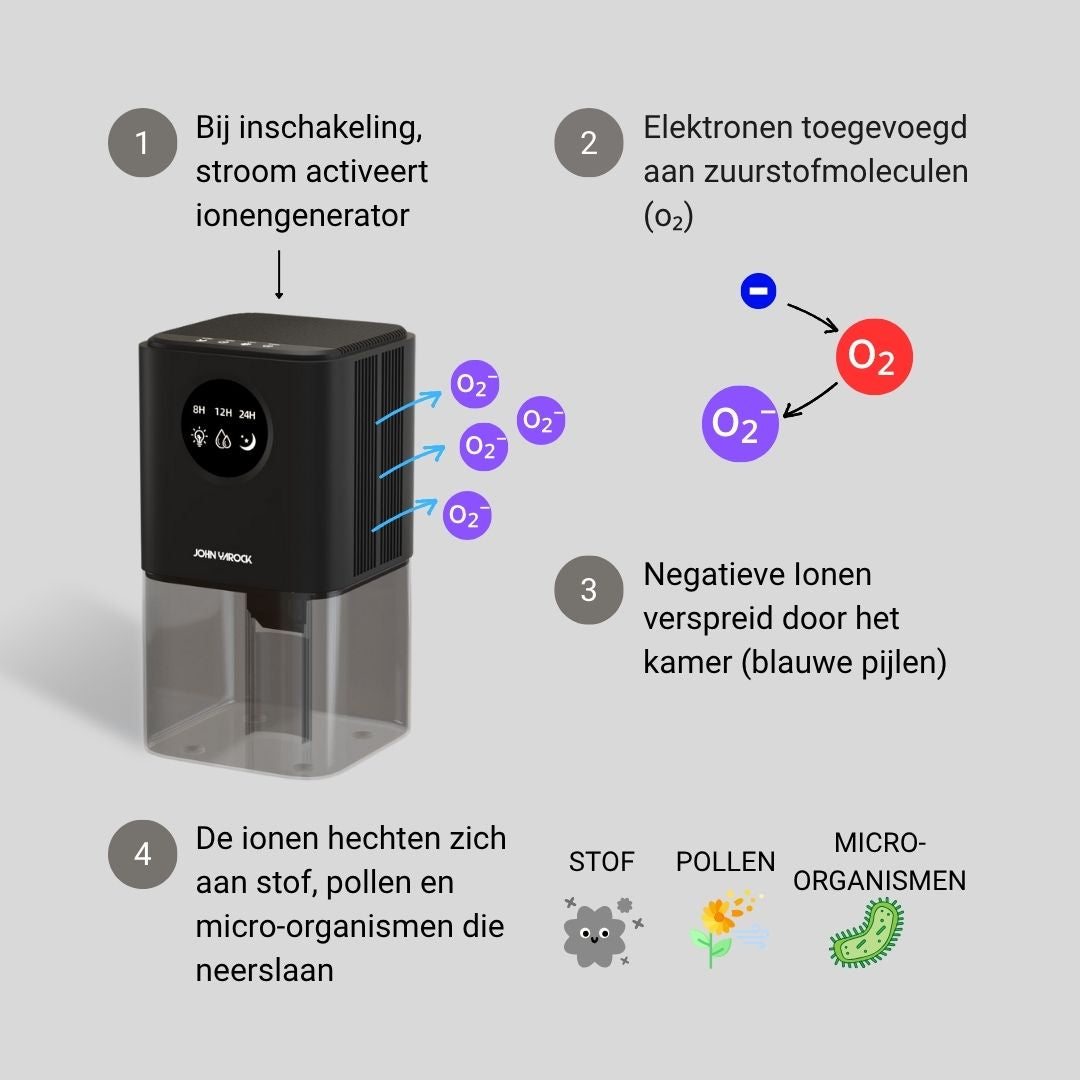 De luchtontvochtiger begint met het aanzuigen van vochtige lucht via een stille ventilator. Binnenin stroomt deze lucht langs een koude plaat, waardoor het vocht in de lucht condenseert tot kleine waterdruppels.